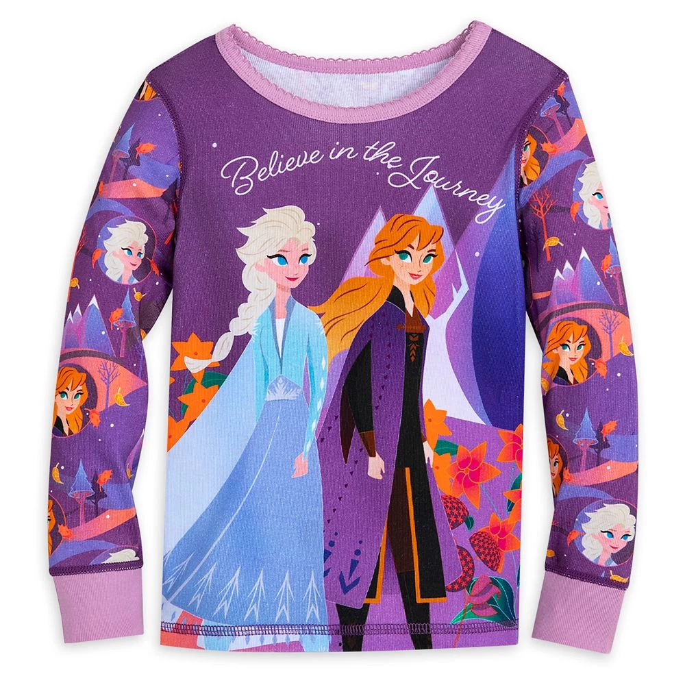 Escape to a nightly adventure in the land of dreams wearing Anna and Elsa’s long sleeve Frozen pajama set with storybook-style art and fancy picot neckline trim. Believe in the journey.